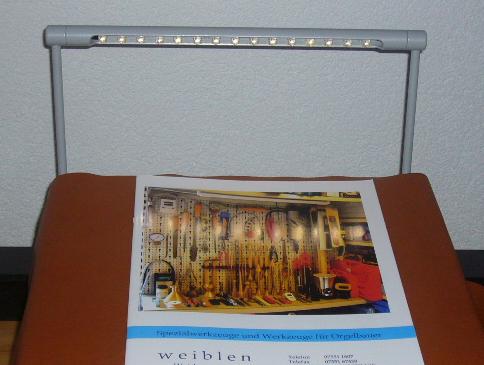 Stromversorgung durch mitgeliefertes Stecker-Netzgerätes für  100 - 230 V Lichtstrom. Soll die Beleuchtung schaltbar sein, muß am Pultgehäuse oder an anderer geeigneter Stelle ein Schalter für die Stechdose angebracht werden. Falls eine Helligkeitsregelung gewünscht ist, kann in das Schwachstromkabel ein Dreh-Dimmer zwischengesteckt werden.