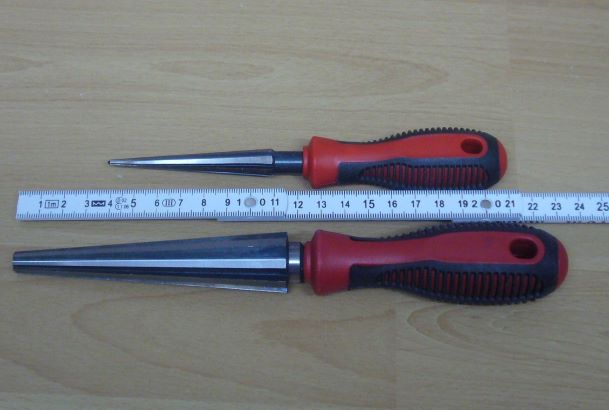 Strong conical reamers with handle for enlarging holes in wood, sheet metal, plastic cans, etc. Available in various sizes and qualities. Sizes and qualities. The simple 3 - 12 mm version with blue handle is suitable for soft materials.