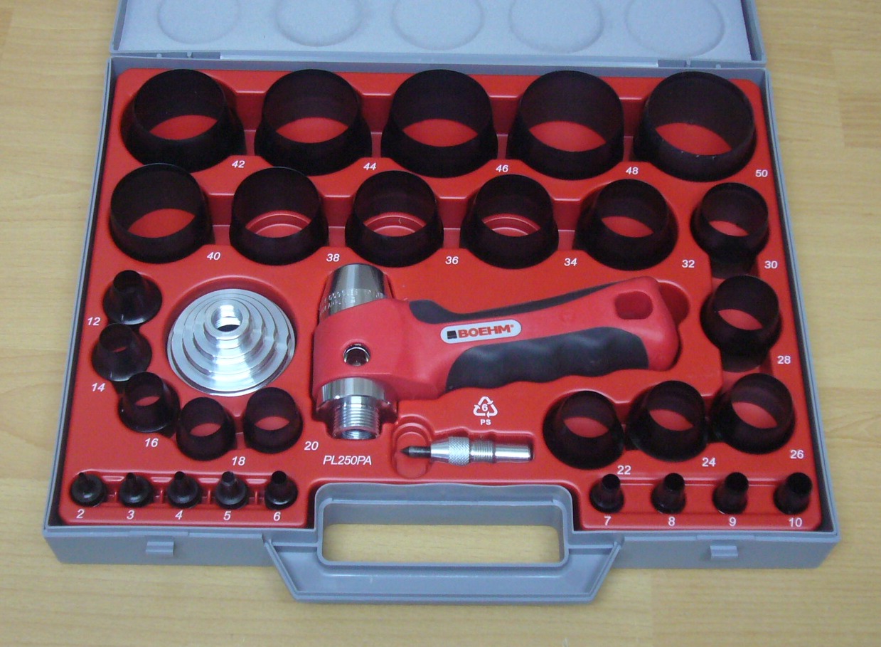 • Ring punch set D= 2 - 50 mm 29 combinable hole punch inserts with D=2, 3, 4, 5, 6, 7, 8, 9, 10, 12, 14, 16, 18, 20, 22, 24, 26, 28, 30, 32, 34, 36, 38, 40, 42, 44, 46, 48, 50 mm with receiving disc. 1 special holder with side handle and centering tip, all in plastic case.