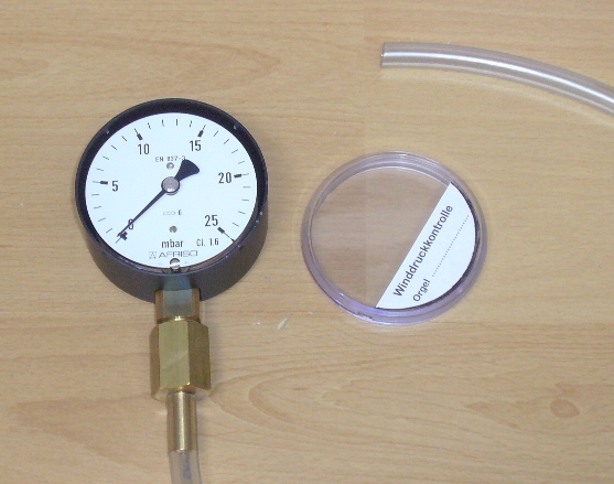 This wind pressure gauge is useful as a stationary pressure gauge. The pressure position of the pointer for each bellows or movement can be noted directly on the scale by removing the protective glass. Regardless of the pressure defined as the "mm water column", the respective pressure is thus fixed when leaving the finished organ and can be checked quickly and easily at each service. However, it is important that the measuring device adjusted to the respective organ is always available for the control measurements and thus remains permanently in the organ.