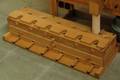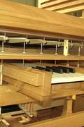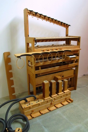 Many practical details are the basis of this "machine", which is made of oak wood with the highest quality craftsmanship. The upper and lower parts can even be stored side by side on a Europallette for transport, saving space. A sep. connectable pedal chest for playing large metal pipes and, by means of conductors, also horizontal wooden and metal pipes, completes the mobile voicing chest. The other parts are manageable and easily transportable.