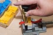 With the garnishing master you can garnish front pin guides rationally. You clamp the keys together and place the one-sided glued garnish strip over the slotted holes.