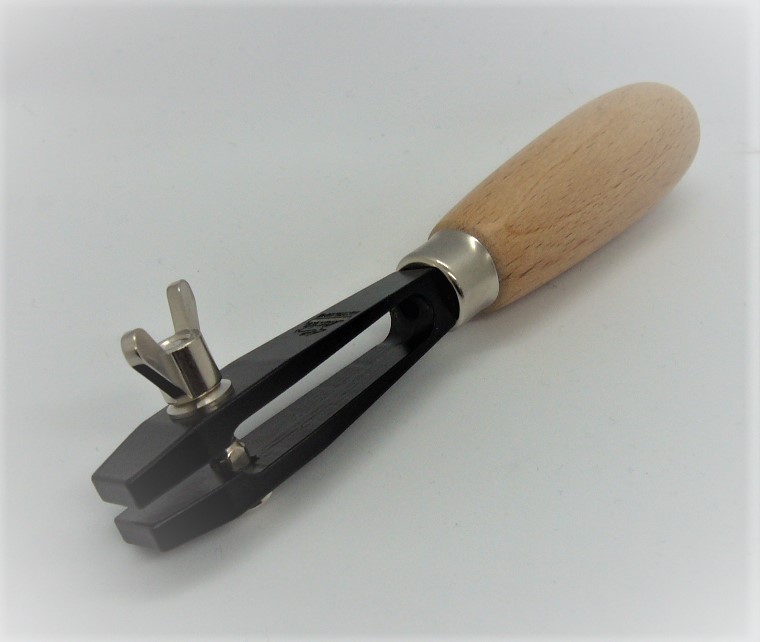 Ideal aid for holding large reeds for processing during voicing or also for tensioning wires. Handle and tensioning nut pierced.