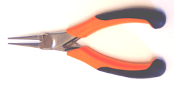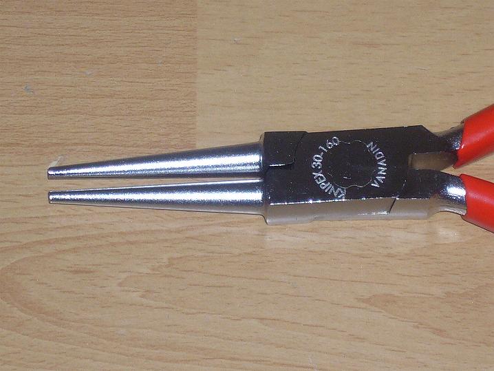 Round nose pliers long and thin with covered handles 150 mm long. 1.5/5.5 and 32 mm long smooth tips.