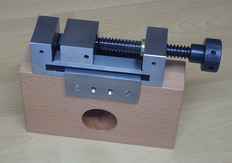 On a beech solid block with additional hole for fastening by means of screw clamp, the precision vise made of ground steel was mounted. Ideal for mounting on a workbench by increasing the working height by 15 cm, but also ideal for clamping in the rear tongs of planing benches. Furthermore, this vice can replace the vice previously offered by ULMIA for machining thin moldings. For this purpose, the vise is clamped with its external mounting surfaces so deeply into the rear collet that the vise jaws protrude only slightly over the planing bench surface. The jaws then hold the thin laths and can be easily machined with the planer when pulled.