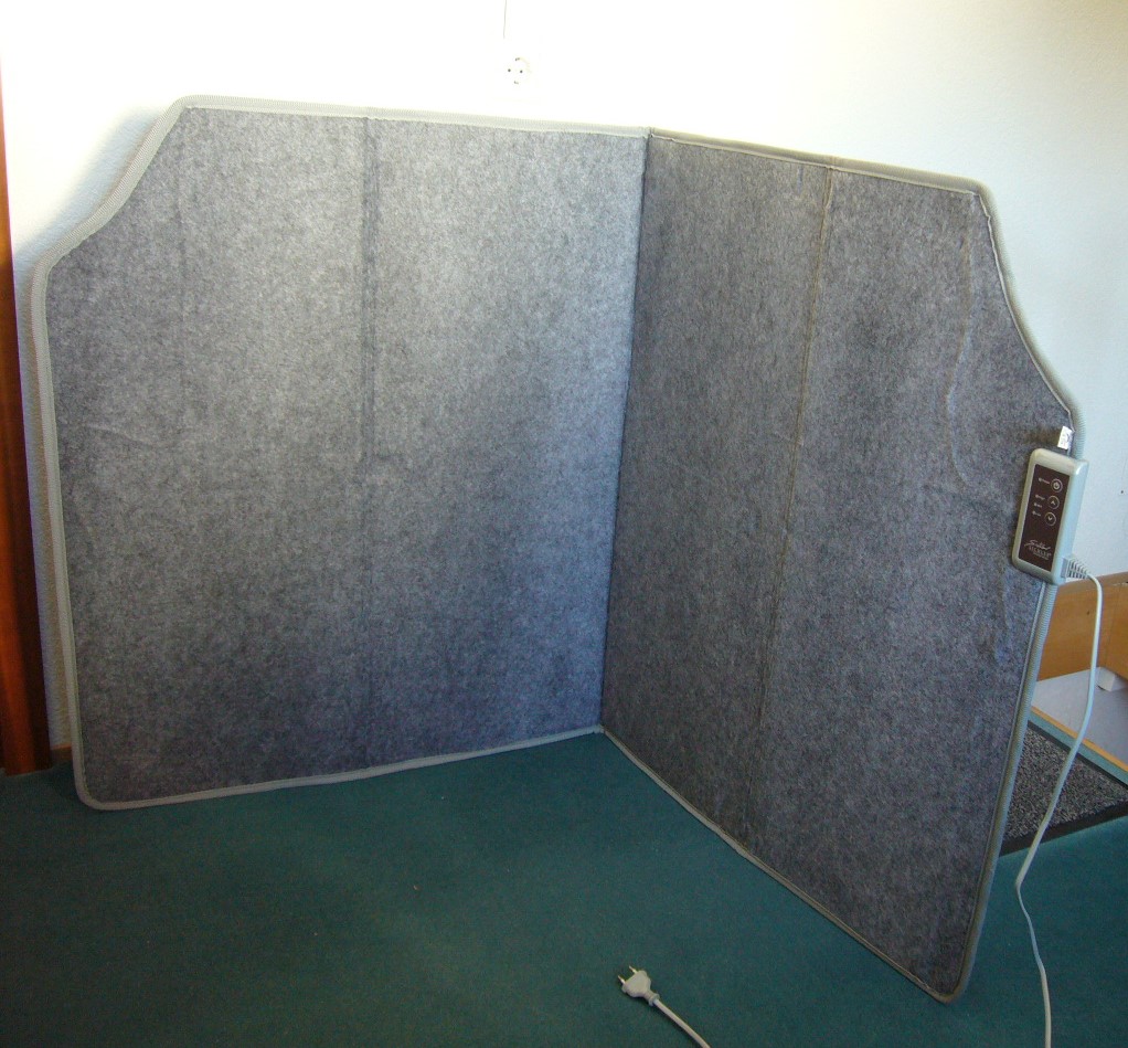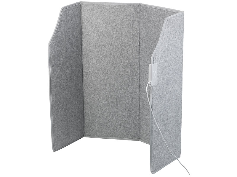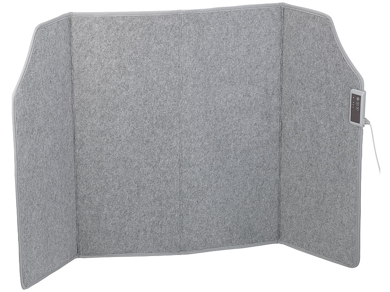 Les éléments chauffants sont répartis sur les 4 surfaces individuelles et appliqués sur des panneaux fins. Tout autour, le panneau est recouvert d'un tissu d'ameublement gris résistant. Contrairement à nos panneaux chauffants infrarouges foncés, qui sont également utilisés dans le paravent chauffant en chêne, ce panneau n'est pas isolé thermiquement du côté opposé au joueur.