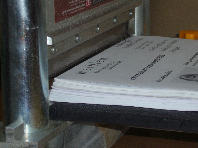 Par rapport aux massicots à lame habituels, cet appareil fonctionne avec une lame parallèle descendante sur toute la largeur de coupe de 320 mm. Le matériau à couper, et donc aussi une pile de papier avec une hauteur de coupe maximale de 15 mm, reste en place sans glisser lors de la coupe. Il est ainsi possible de réaliser des coupes de quelques millimètres seulement sur des piles de papier entières, ainsi que des découpes de piles de papier exactement selon vos indications.