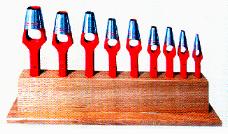 Jeu de fers à entailler 9 pièces avec des trous de D= 3, 5, 7, 8, 10, 11, 13, 16, 19 mm, y compris le support en bois.