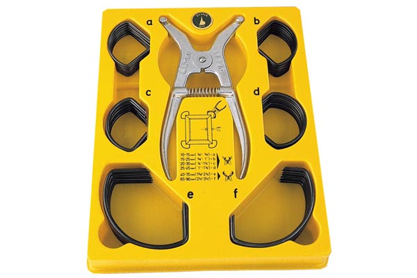 La garniture de travail se compose de 8 pinces de serrage de 6 tailles différentes. Les agrafes sont rangées de manière claire dans une boîte transparente.