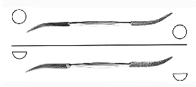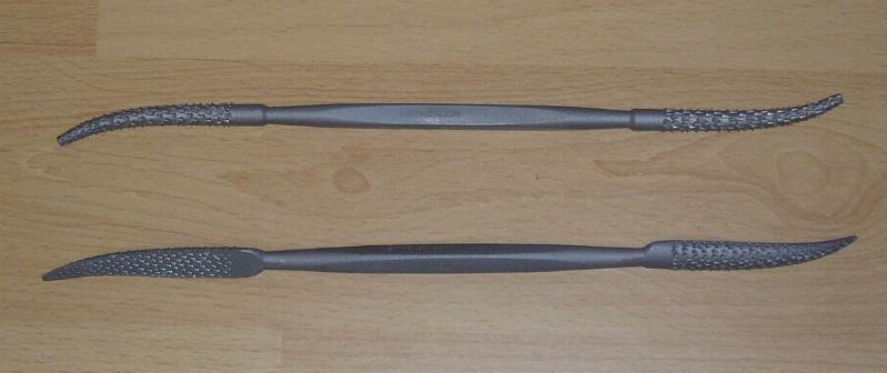 Dünne gekröpfte an beiden Enden behauene Rund- bzw. Halbrundraspel. Optimal für Nacharbeiten an Pfeifenstocklöchern oder andere schwer zugängliche Stellen.